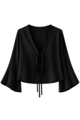 It features two delicate front ties that allow for adjustable coverage and styling — wear it open for a relaxed layered look or tied for a more defined silhouette. The relaxed sleeves add a romantic, airy feel, making it perfect for warm days and chic evenings alike.