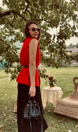 Stay stylish and comfortable with this red linen vest. Featuring a mid-length cut that falls to the hips, it’s perfect for layering over any outfit. The top tie closure with a drawstring adds a subtle, adjustable detail, while the lightweight, breathable linen keeps you cool in warmer weather. Effortless, versatile, and chic – a must-have addition to your wardrobe.